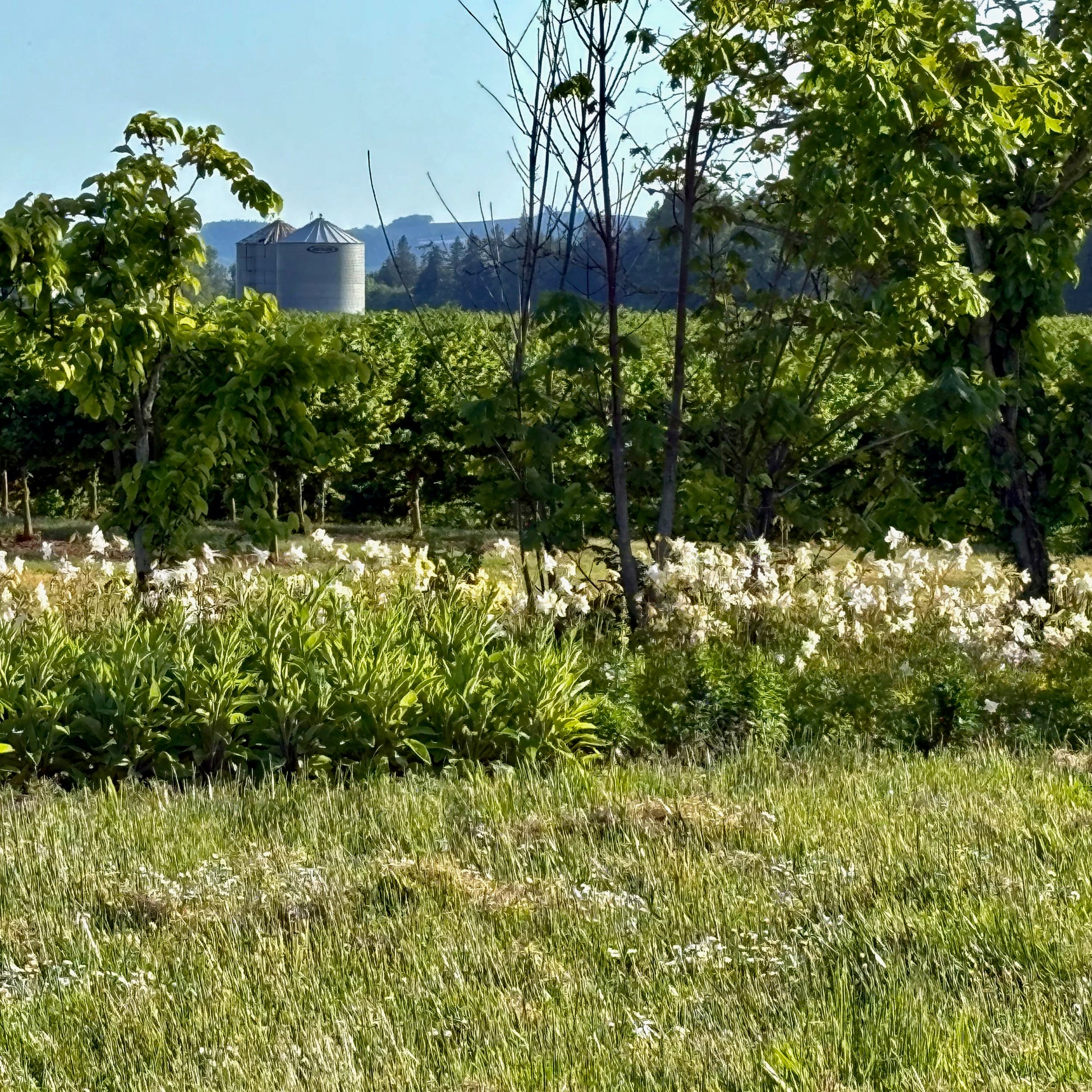 A Columbine with large flowers often 3“ long. Some are pure white from the top through their long spurs while others have buttery yellow blades (the inner petals) or are tinged with the palest blush of lavender on the tips of the sepals (outer petals) and spurs. With many tall rigid stems (2.5 ft.) and almost no leaves, this is an excellent spring cut flower. ‘Crystal Star’ makes a luxurious addition to a wedding bouquet. Great performance in both sun and partial shade. We saw many species of bumble bees on all our Columbines this year. Perennial.