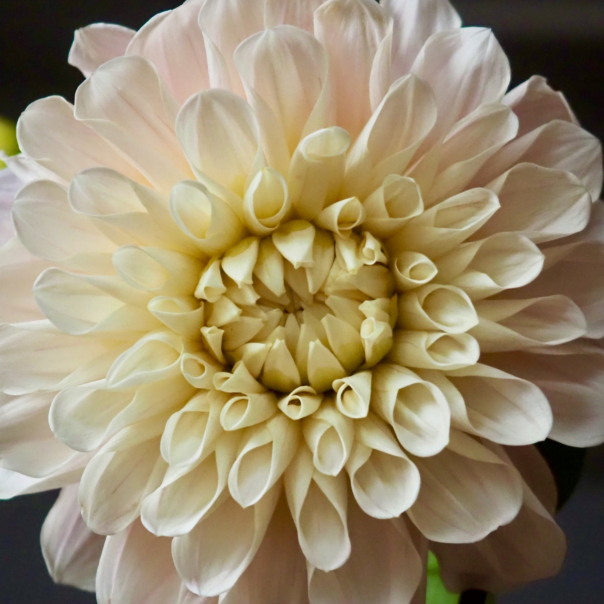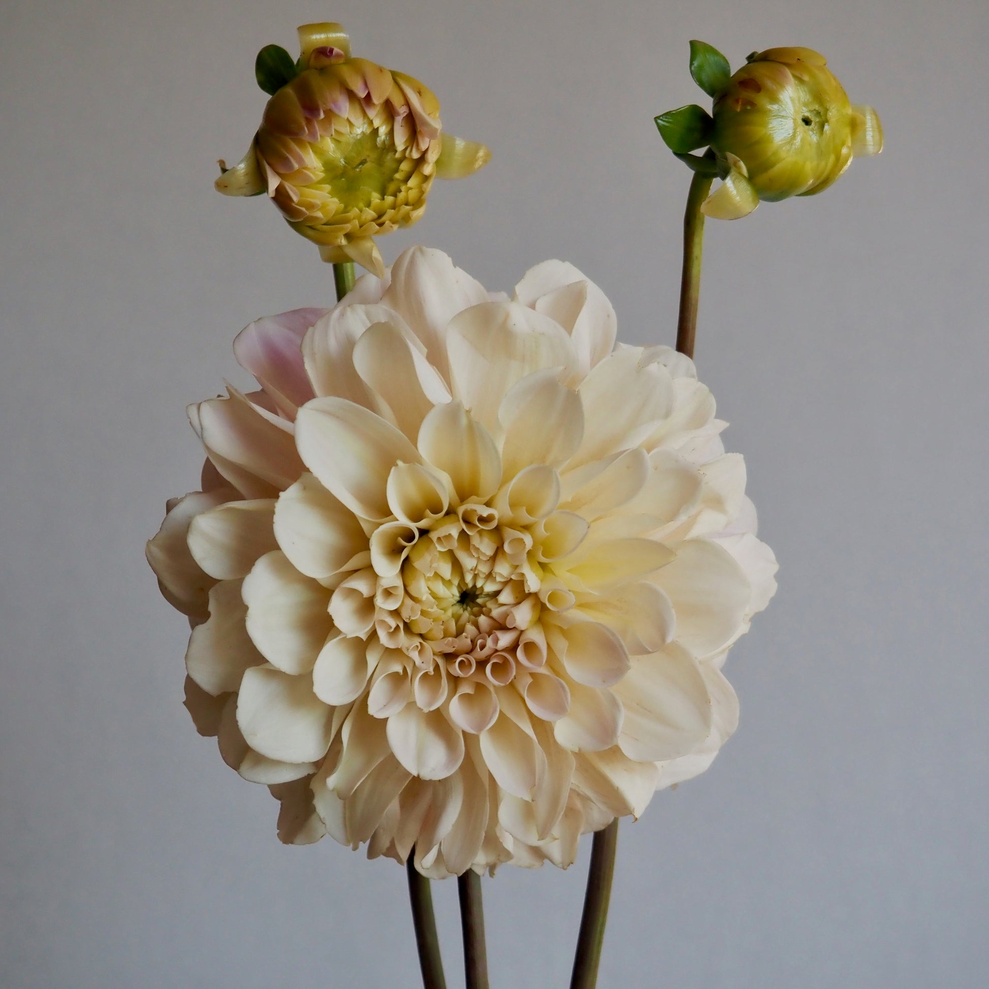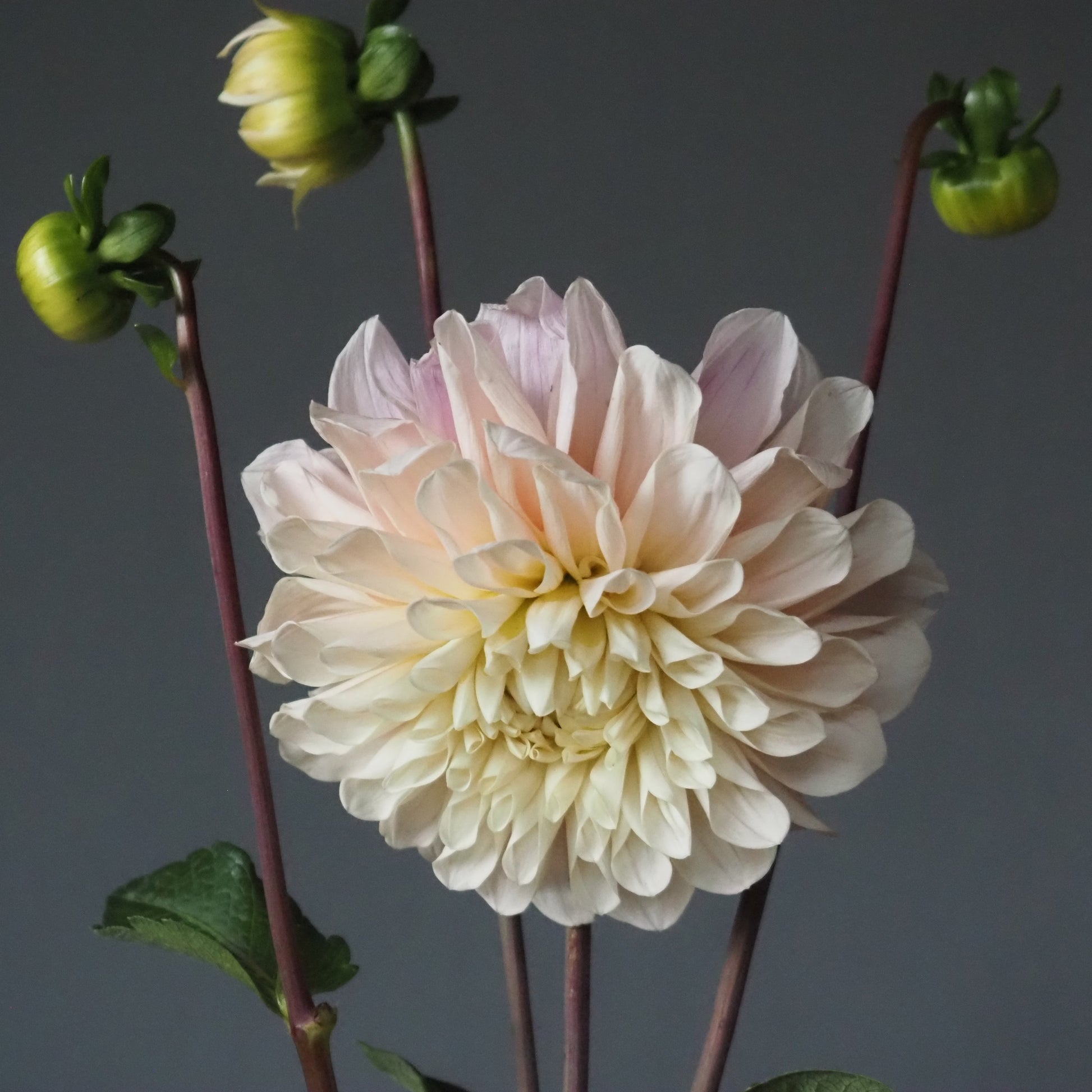A really stunning blush dahlia with an unmistakable cool tone that is unique! They really shine in the late season, where they seem almost irridescent. Larger blooms nod down slightly, so they are better for composed arrangements than market bouquets. A great wedding flower! Plants are about 4' tall, a moderate bloomer with 5" wide flowers.