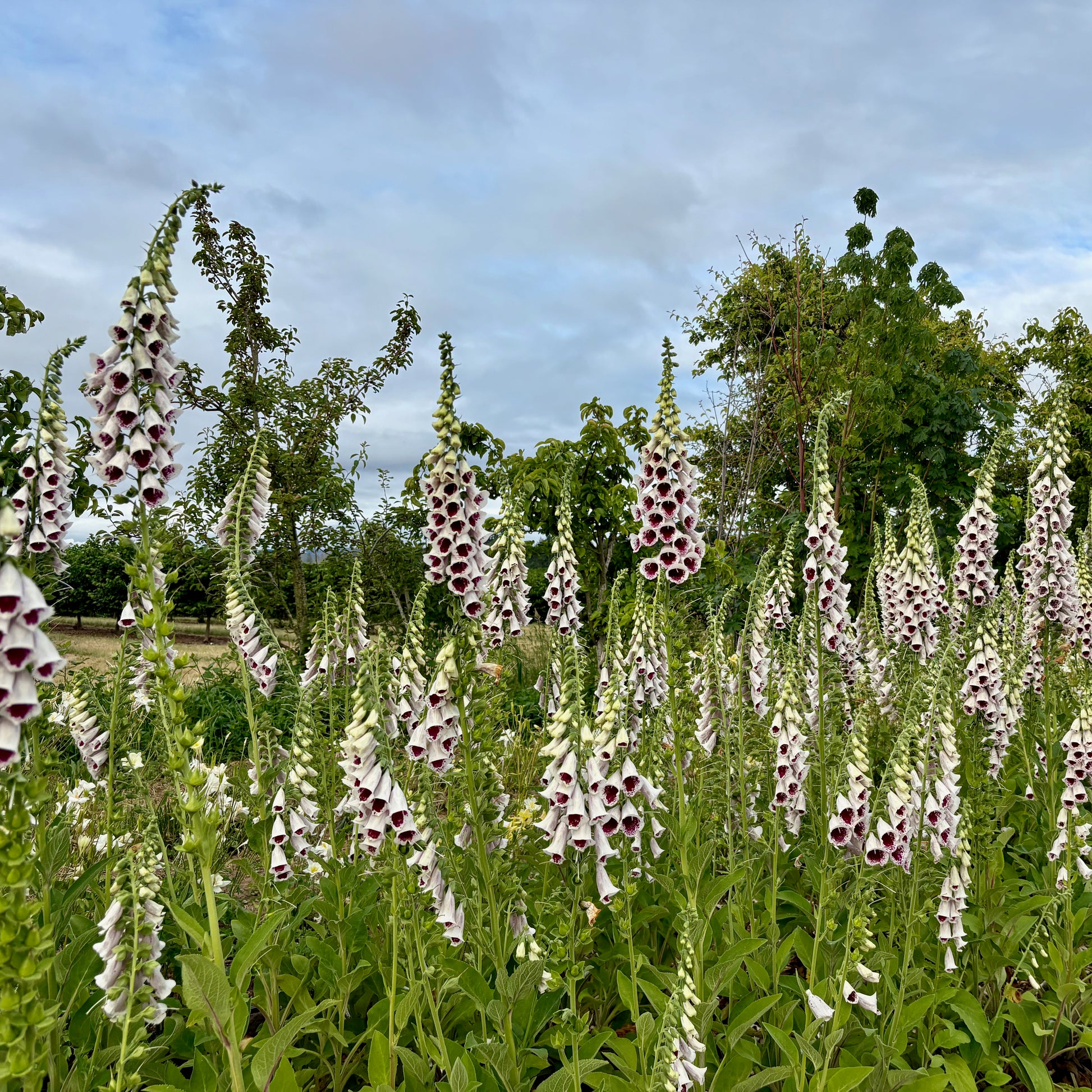 I love this variety! This strain is true to type and incredibly productive. Its spotted throat is a dark shade of maroon and a gorgeous contrast with its large crisp white blooms. I can't think of another flower with this color combination. Super tall, super long bloom period and so many stems. Great for spring weddings. Shear back and you might have some smaller stems later in the season. Attracts bumblebees and hummingbirds. Biennial.
